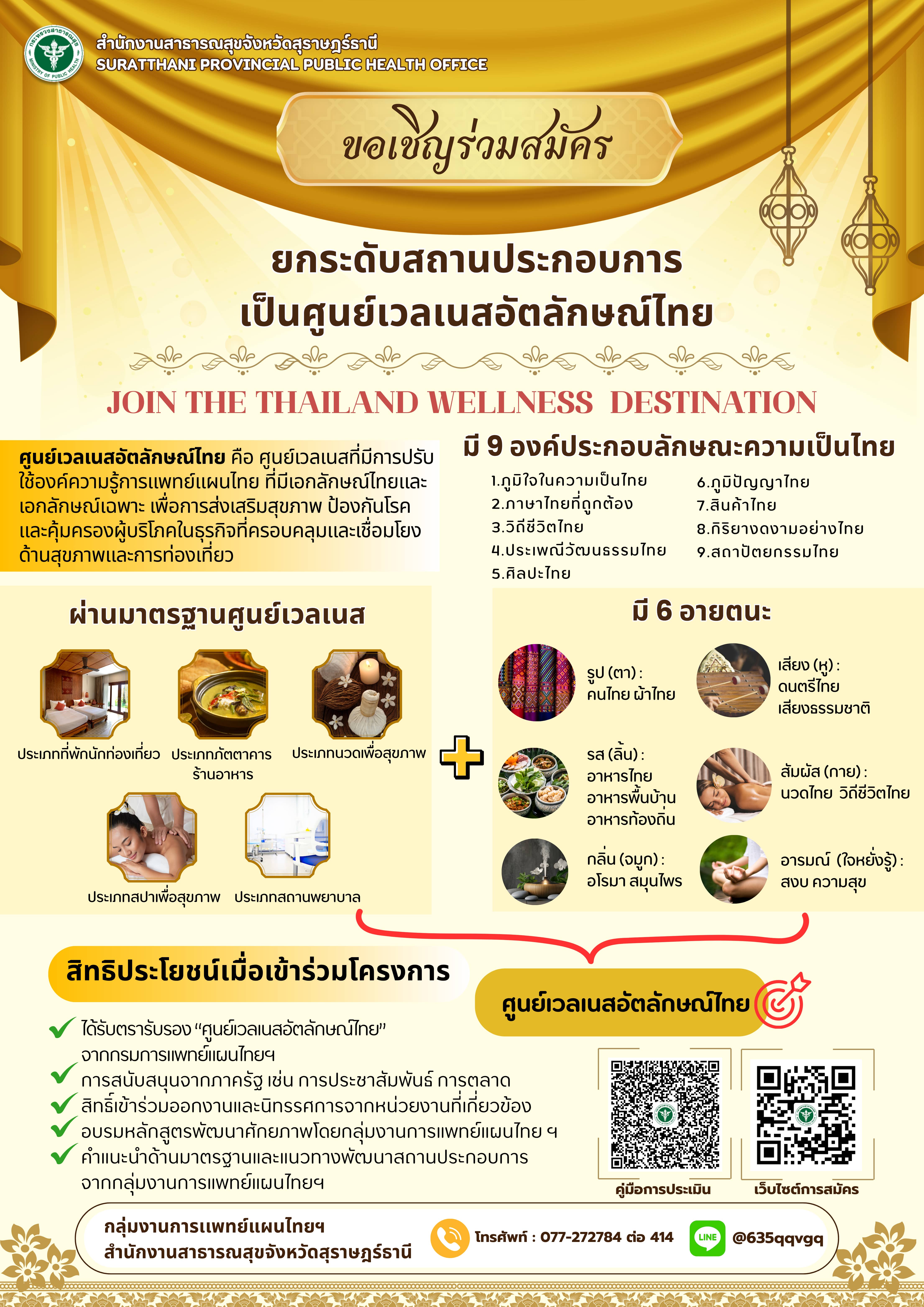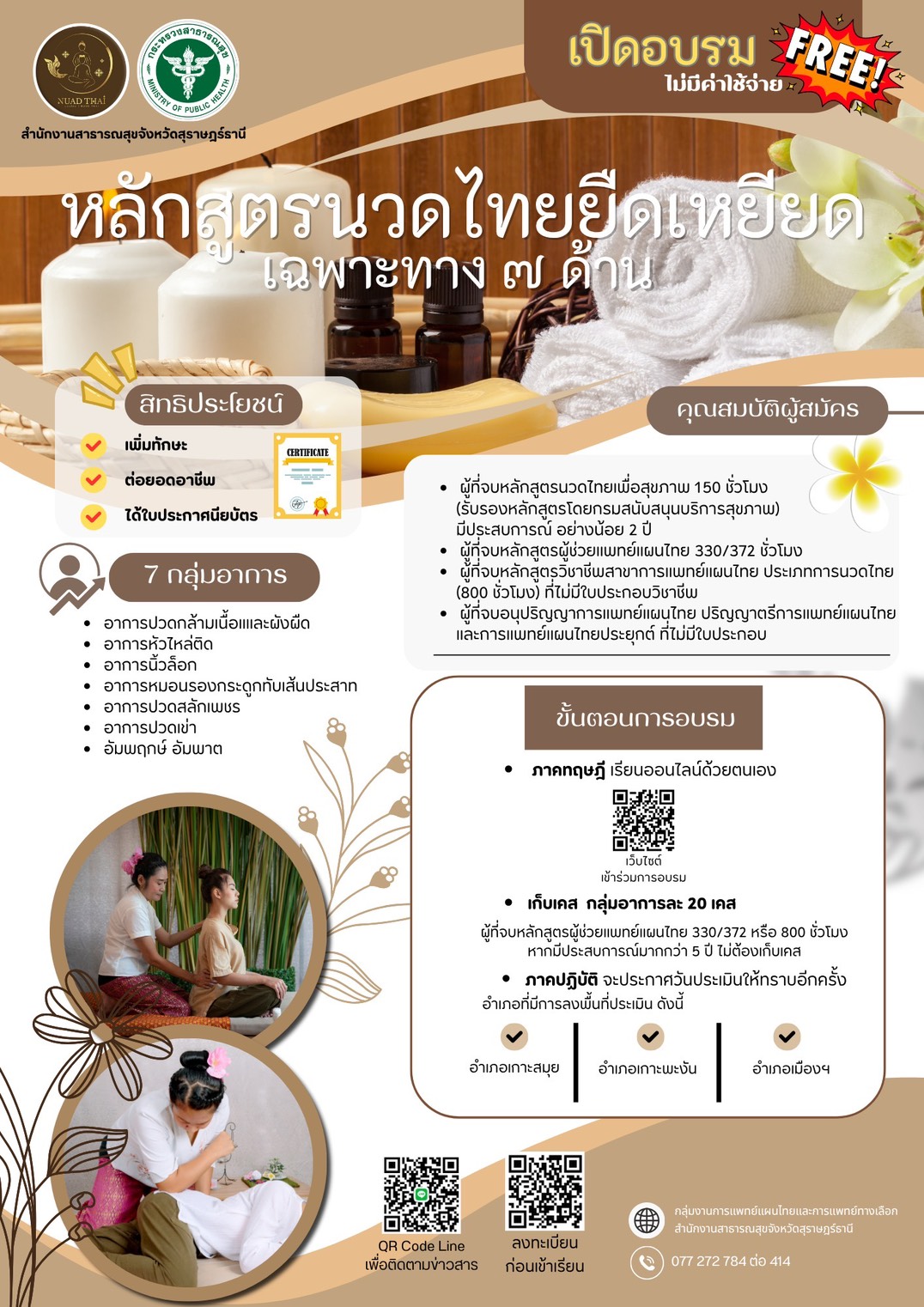 ศูนย์ส่งเสริมสุขภาพแผนไทย 077-272784 ต่อ 216 หรือ 080-3923798